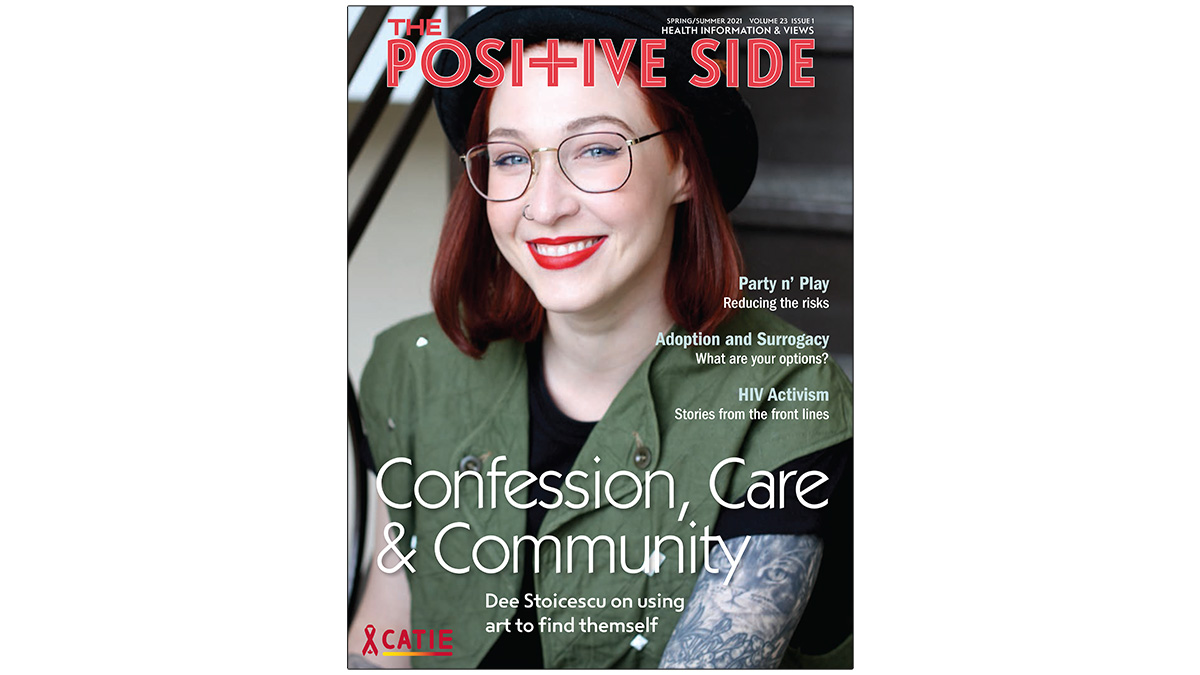 Health and wellness magazine for people living with HIV. In this issue: artist and activist Dee Stoicescu; Party n’ Play; adoption and surrogacy; HIV activists; supervised consumption sites; Wellness Wheel; sex and COVID-19; CATIE at 31