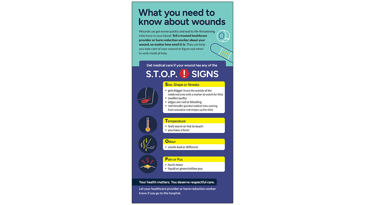 This pocket-sized resource contains basic harm reduction information for people who use drugs about what to do if someone has a wound. It encourages people to talk about wounds with a healthcare provider or harm reduction worker, and includes signs that indicate when to get medical care, as well as tips on how to take care of wounds.