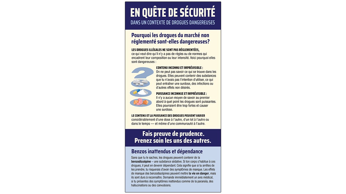 Cette carte de poche format portefeuille fournit des renseignements sur les risques liés à l’approvisionnement en drogues non réglementé et des conseils pour planifier sa sécurité. Les prestataires de services peuvent la remettre à leur clientèle pour appuyer les conversations sur l’utilisation de drogues à moindres risques, ou encore la glisser dans les trousses de réduction des méfaits pour que ces renseignements vitaux restent à portée de main.