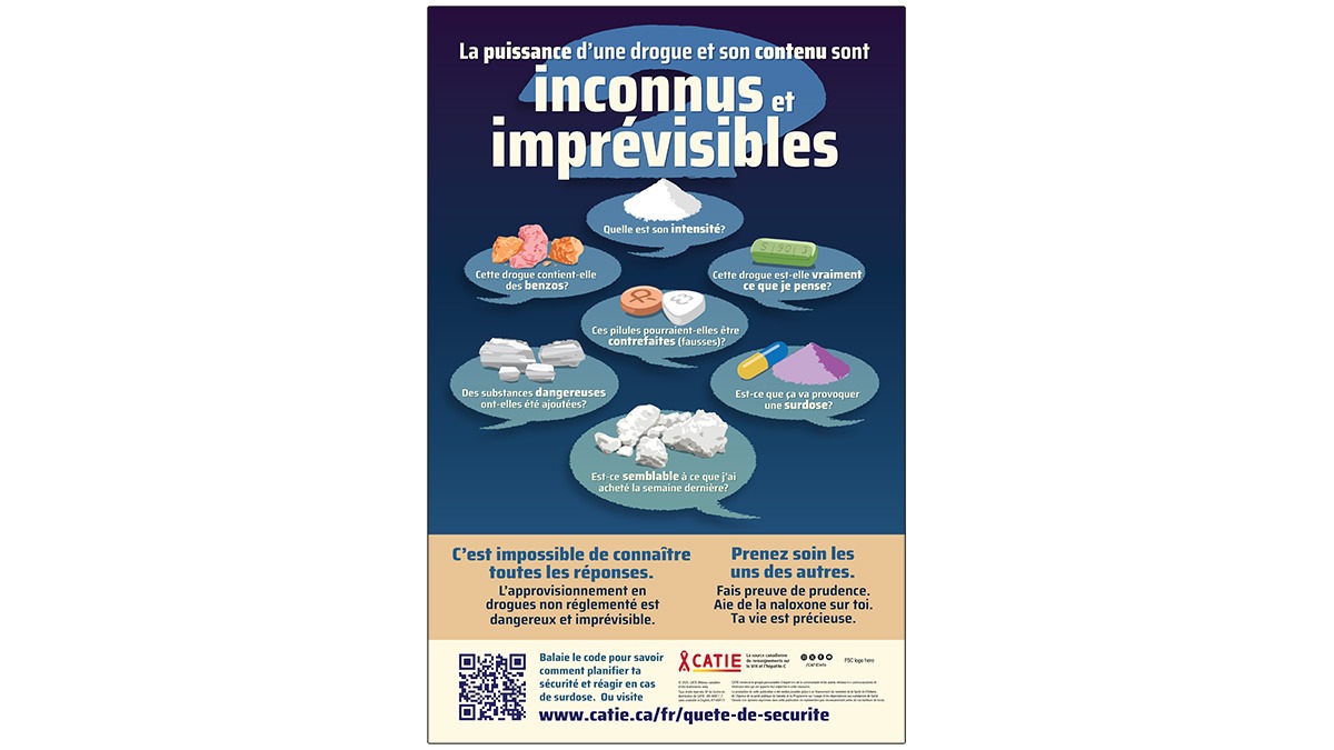 Cette affiche de réduction des méfaits propose des outils concrets pour aider les prestataires de services à soutenir leur clientèle face aux dangers de l’approvisionnement en drogues non réglementé. Elle comprend un code QR menant à des ressources sur les stratégies d’intervention en cas de surdose et sur l’utilisation de drogues à moindres risques. Elle peut être affichée dans n’importe quel milieu de service, même en dehors des contextes de réduction des méfaits, pour amorcer d’importantes conversations sur les pratiques plus sécuritaires.
